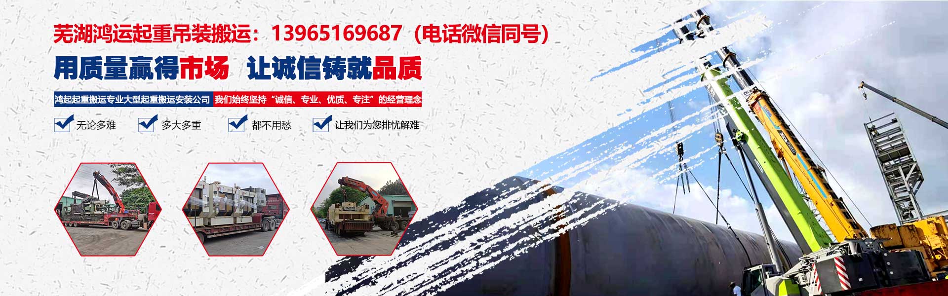 湖市鴻運(yùn)起重裝卸有限公司從事專(zhuān)業(yè)機(jī)械設(shè)備維修安裝:承接大件起重設(shè)備搬運(yùn)安裝工程。吊裝移位、大型機(jī)床、注塑機(jī)、冷水機(jī)組、發(fā)電機(jī)、醫(yī)療設(shè)備、印刷機(jī)、空調(diào)機(jī)組、鍋爐等安裝調(diào)試。油壓機(jī)、離心機(jī)組。橋梁架設(shè)、機(jī)場(chǎng)、港口、鐵路、機(jī)械設(shè)備搬等。承接市區(qū)及省內(nèi)外大笨重設(shè)備起重、運(yùn)輸就位??照{(diào)機(jī)組,電梯吊裝,物流運(yùn)輸?shù)?,廠(chǎng)房、單位、工廠(chǎng)、學(xué)校、工程搬家、保潔。